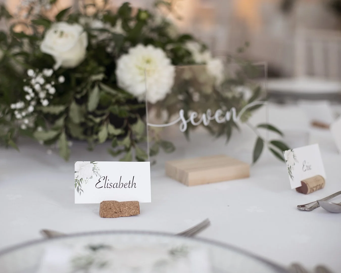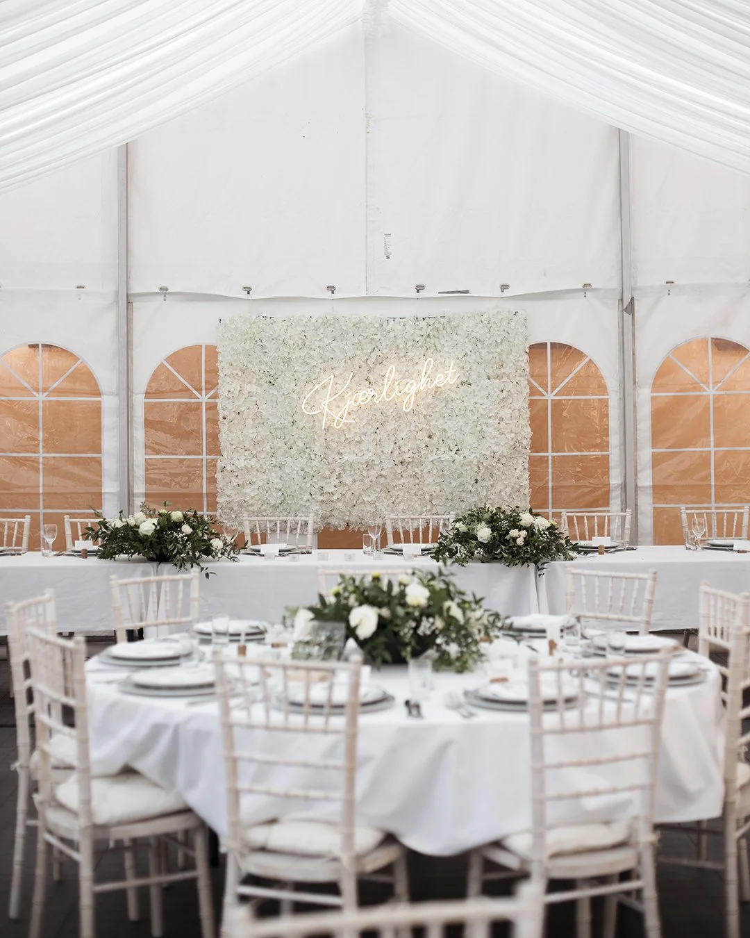 Noe som aldri slår feil er et klassisk fargetema med hvitt som base, grønt og med innslag av beige/naturelementer. I fjor sommer rigget vi til bryllup i et stort telt i bakgården til Bogstad gård. Her fikk vi tatt i bruk vårt fantastiske “Kjærlighet”- neonskilt som vi monterte på en enkel, hvit blomstervegg bak brudeparets plasser. På bordene dekorerte vi med egendesignede menyer, og bordkort med holdere lagd av vinkorker.