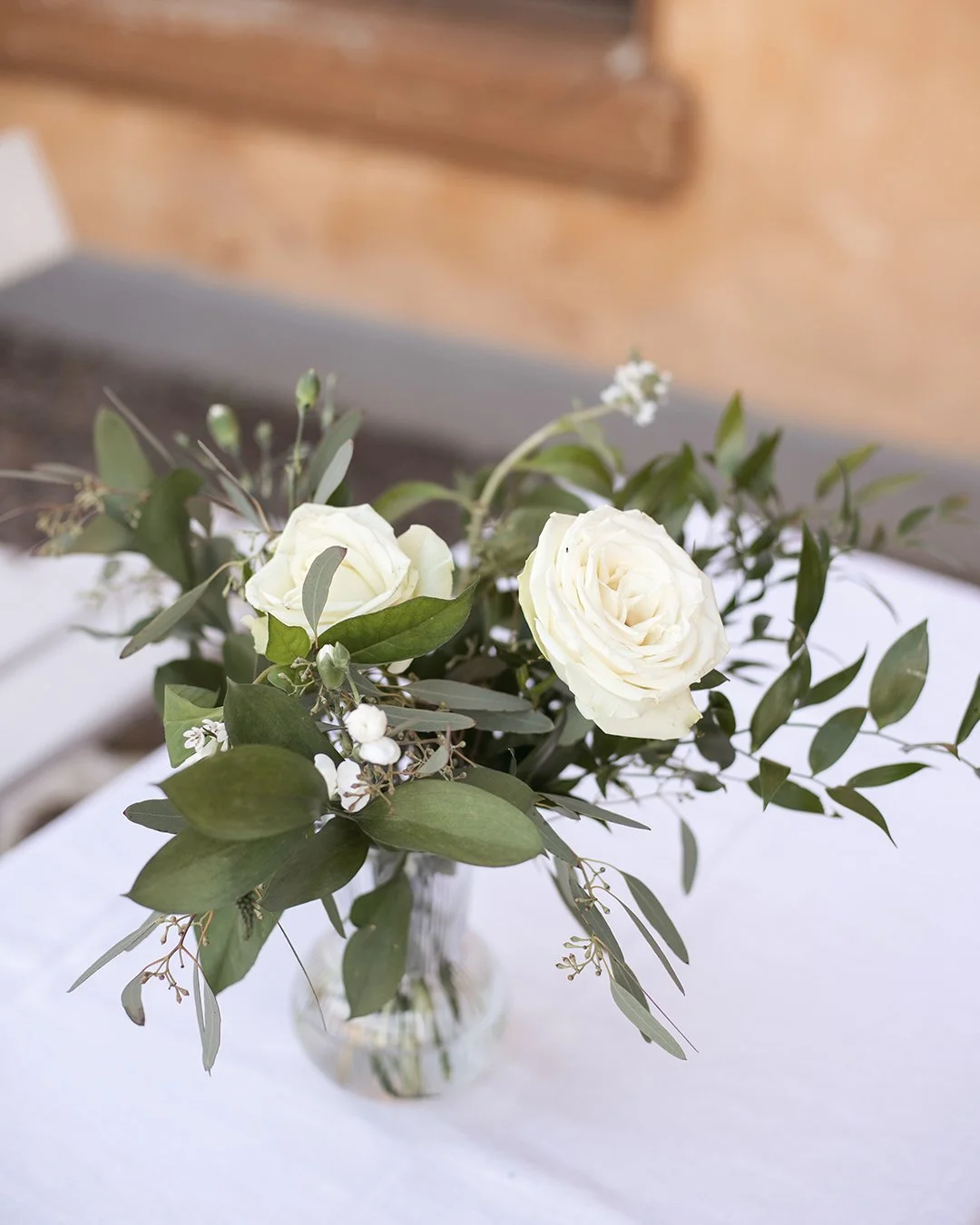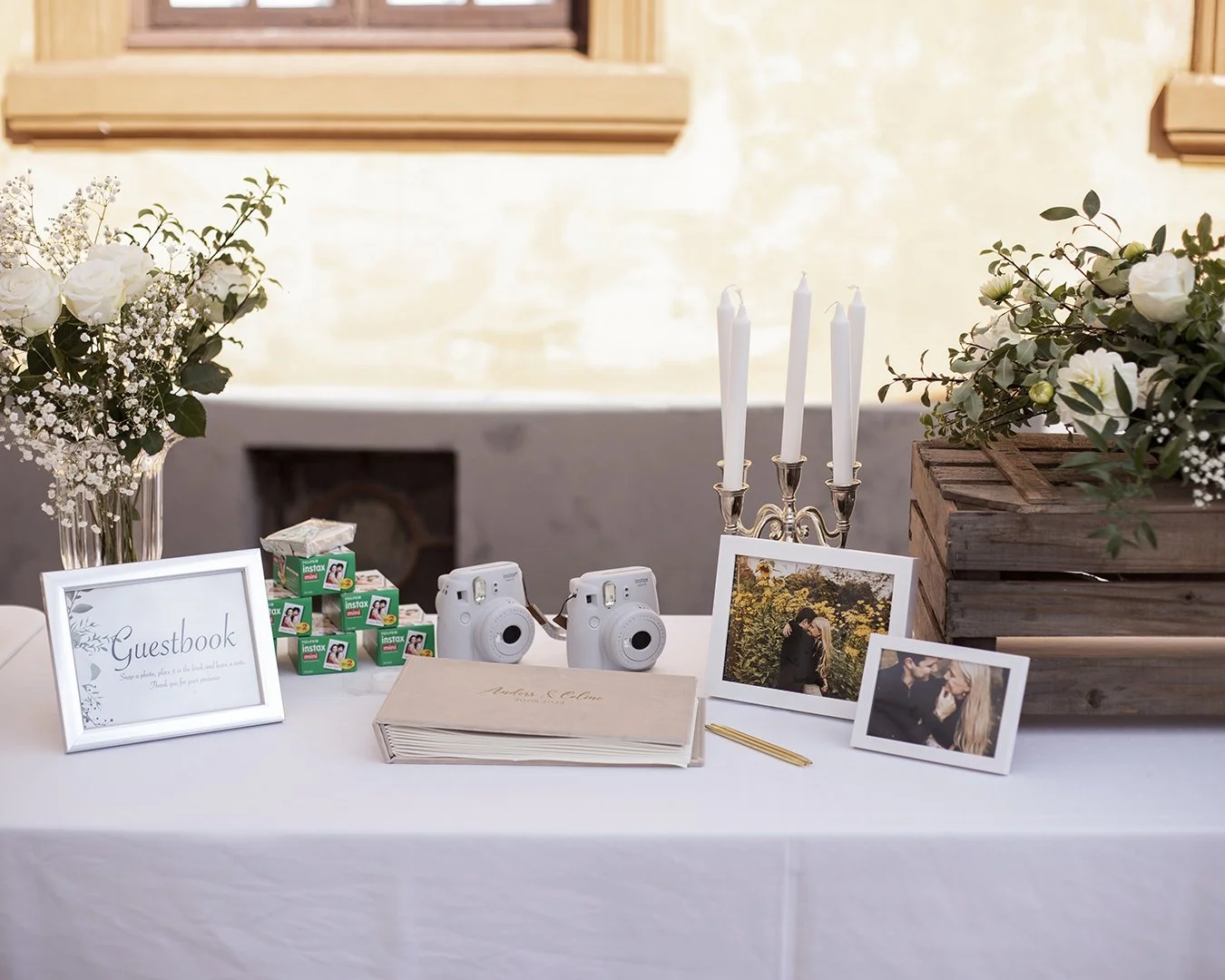 Utenfor teltet disponerte de plass i bakgården til gjestebokstasjon, minglebord der vi sto for blomstene og en fantastisk kul prosecco van som vi dekorerte med ballonger og bladranker. Festen endte innendørs der vi hadde dekorert med flere matchende skilt og ballonger.